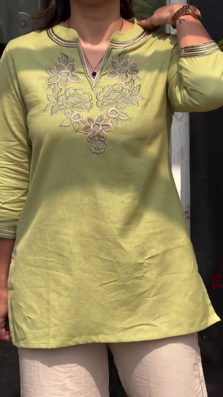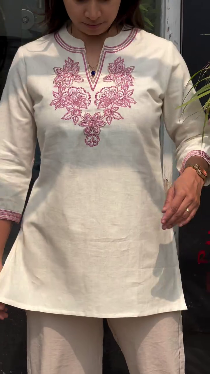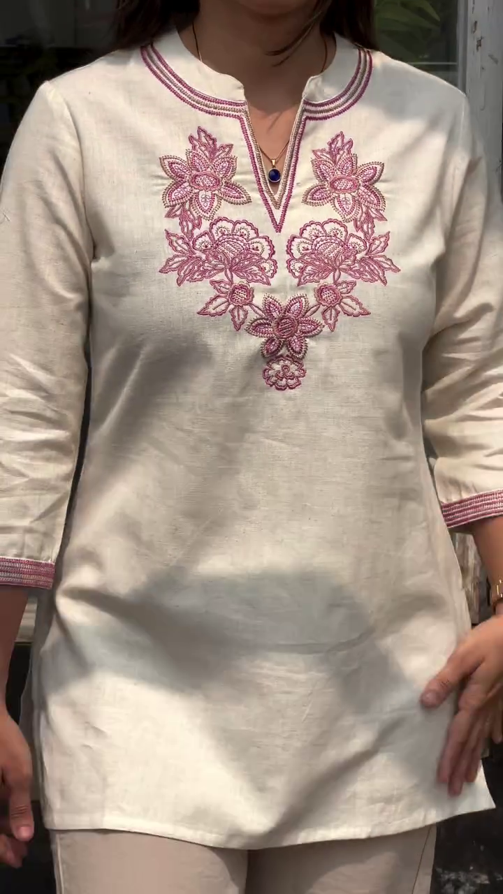 Floral Yoke Design Mandarin Collar Thread Work Pure Cotton Straight Kurta