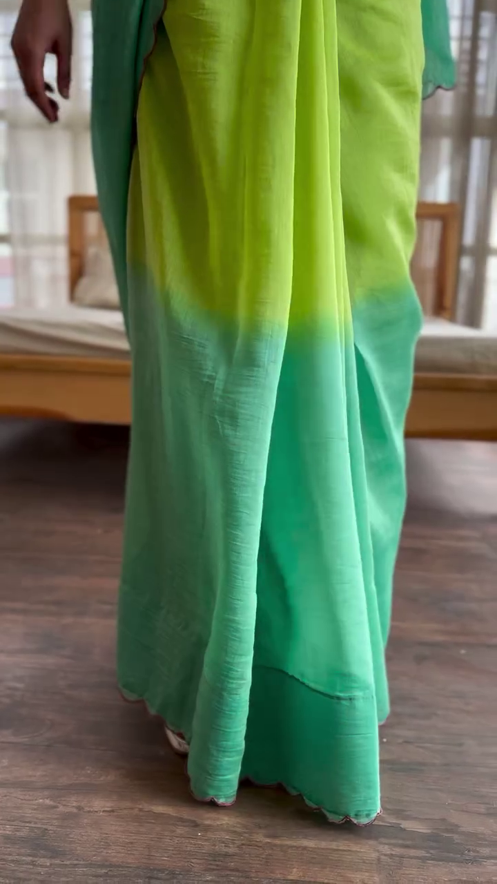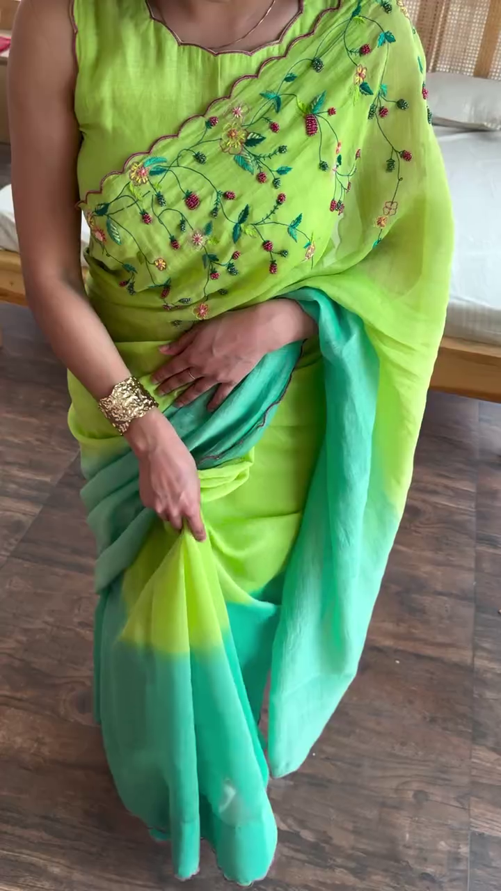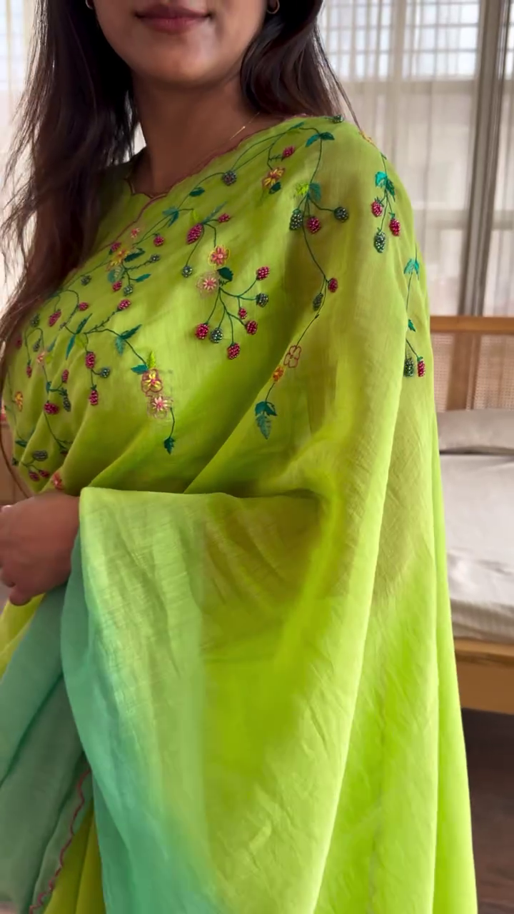 + Free ShippingMeadow bloom chanderi saree – a harmony of nature and elegance. This enchanting green ombré saree, crafted in lightweight chanderi fabric, flows effortlessly with its serene gradient hues. The palla is adorned with a meticulously hand-embroidered berries jaal design, capturing the essence of lush orchards with intricate detailing.