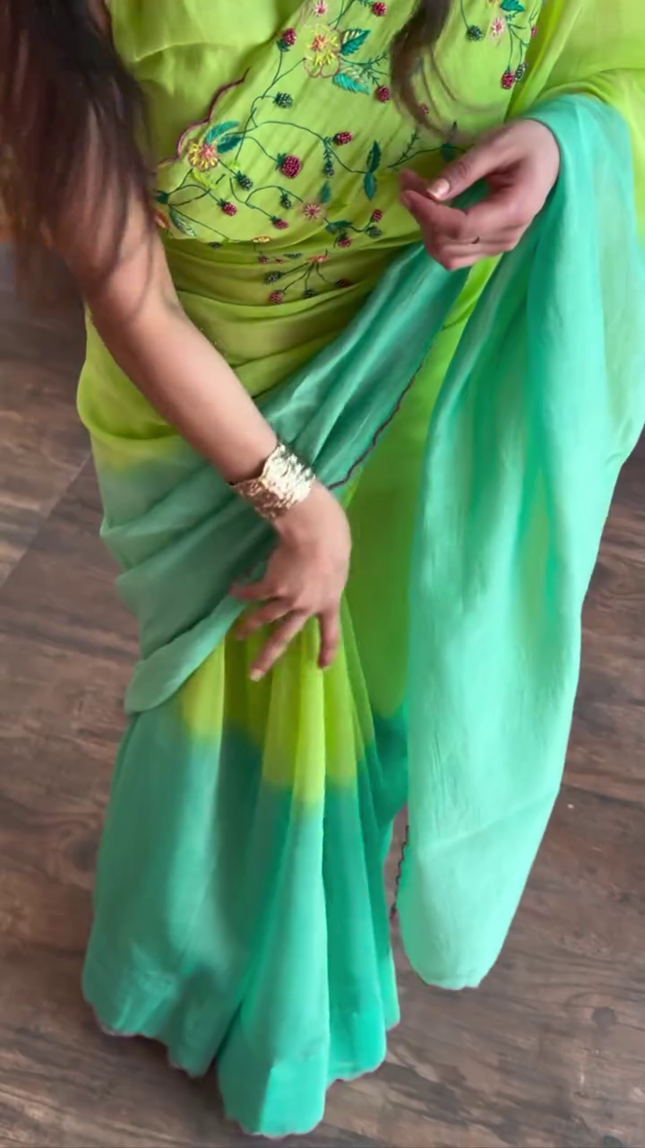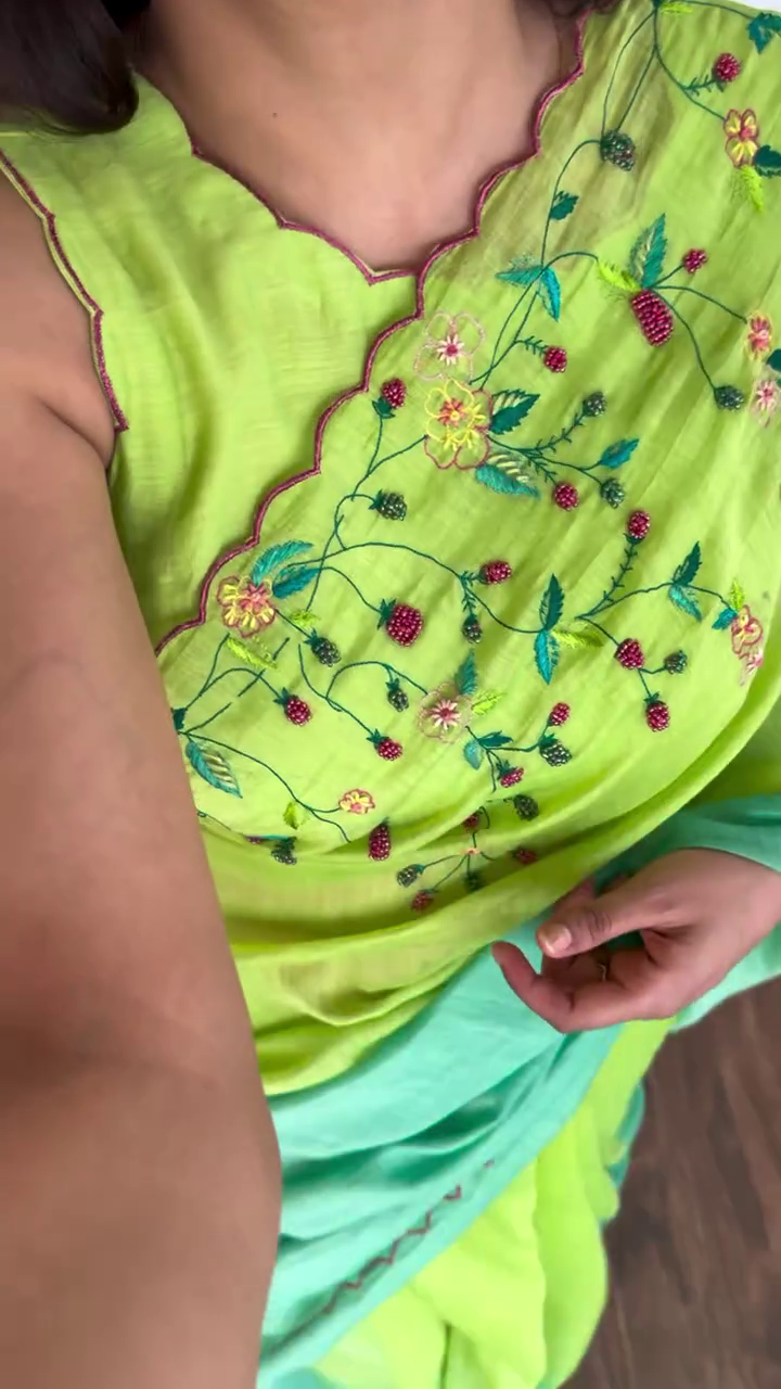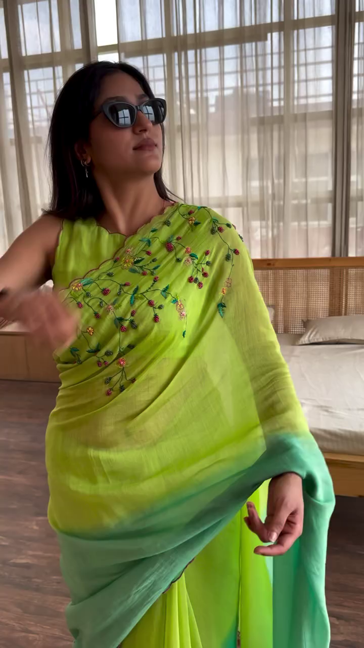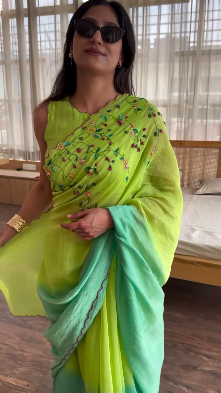 + Free ShippingMeadow bloom chanderi saree – a harmony of nature and elegance. This enchanting green ombré saree, crafted in lightweight chanderi fabric, flows effortlessly with its serene gradient hues. The palla is adorned with a meticulously hand-embroidered berries jaal design, capturing the essence of lush orchards with intricate detailing.