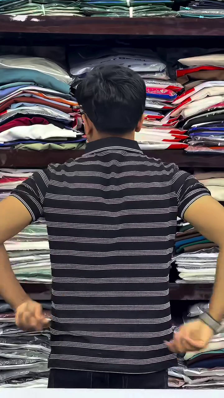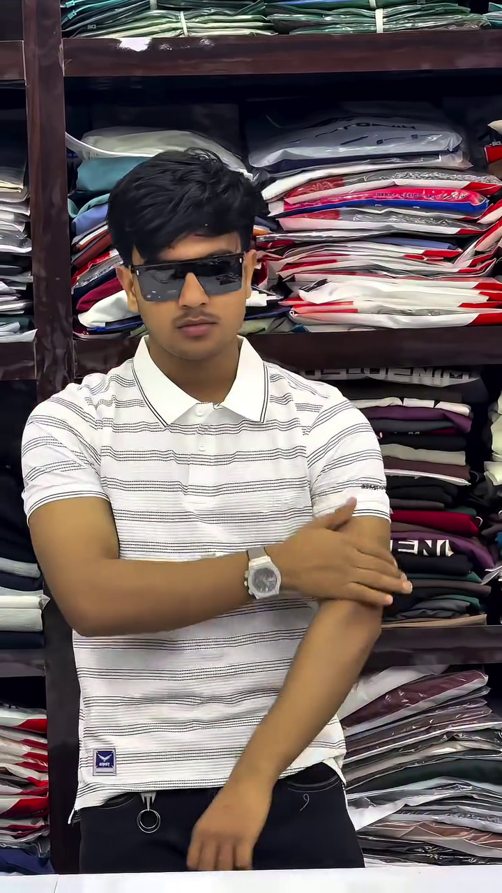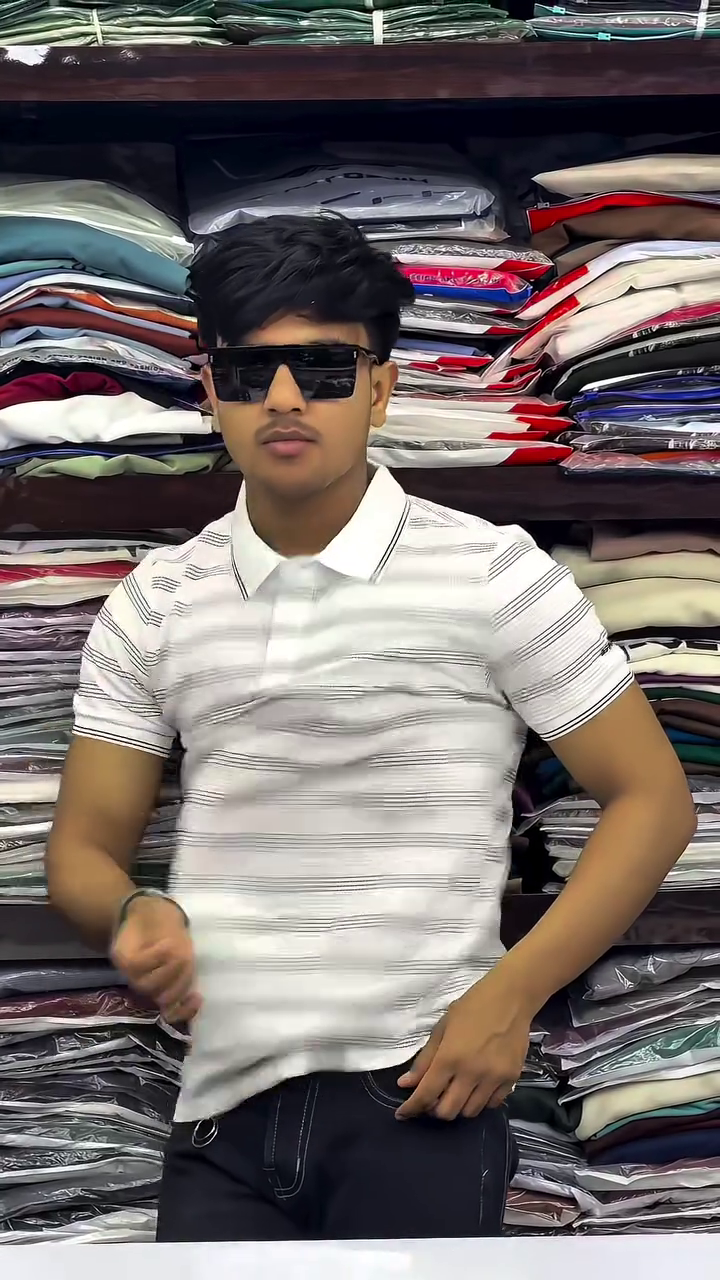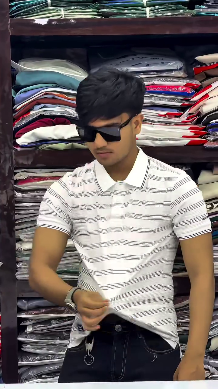 White and navy blue striped T-shirt, has a polo collar, short sleeves