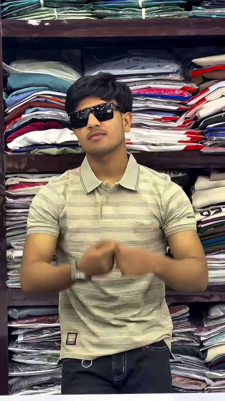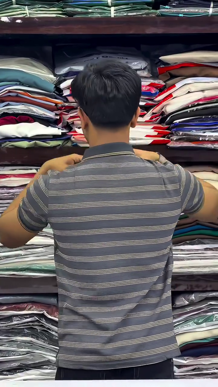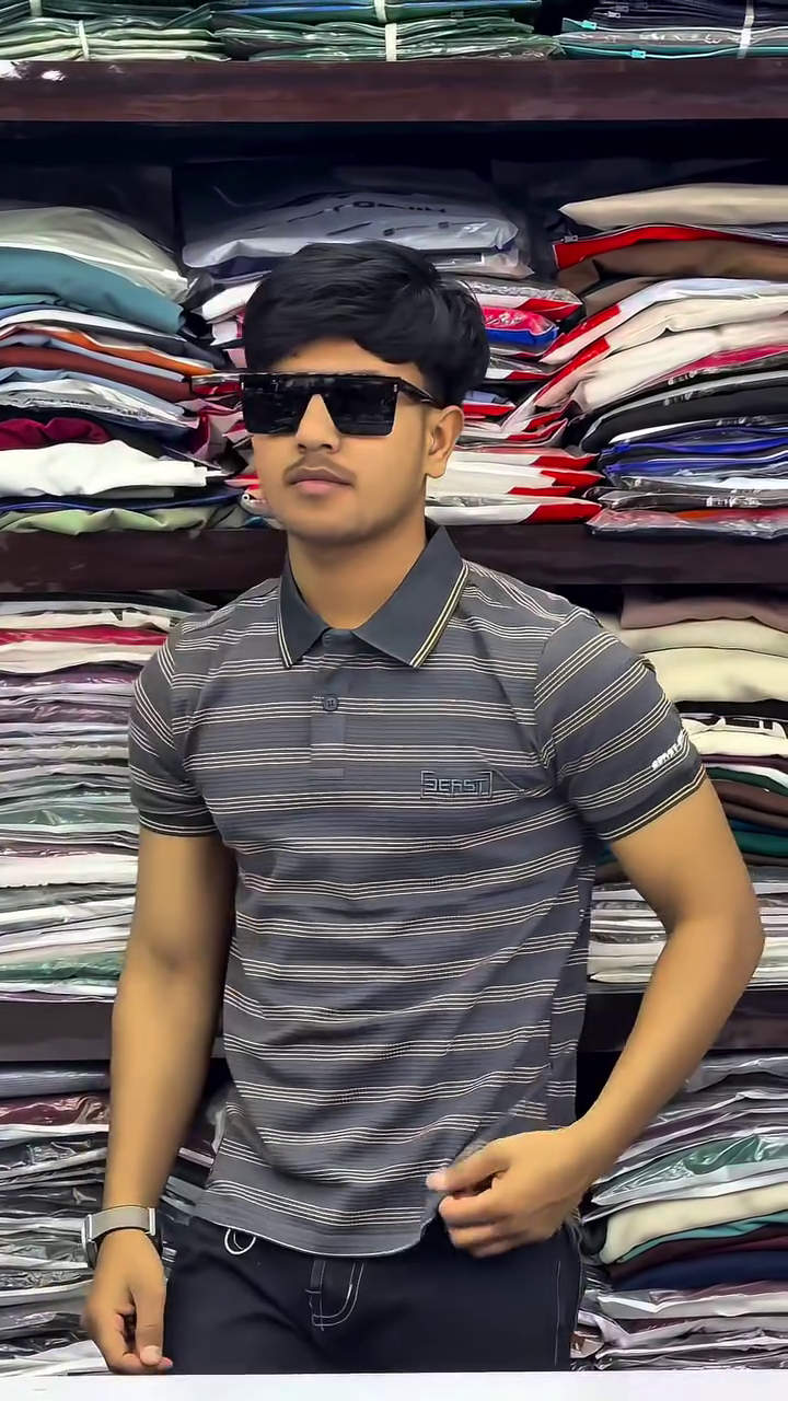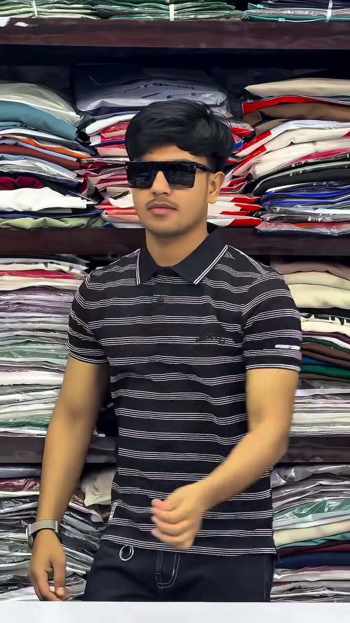 White and navy blue striped T-shirt, has a polo collar, short sleeves