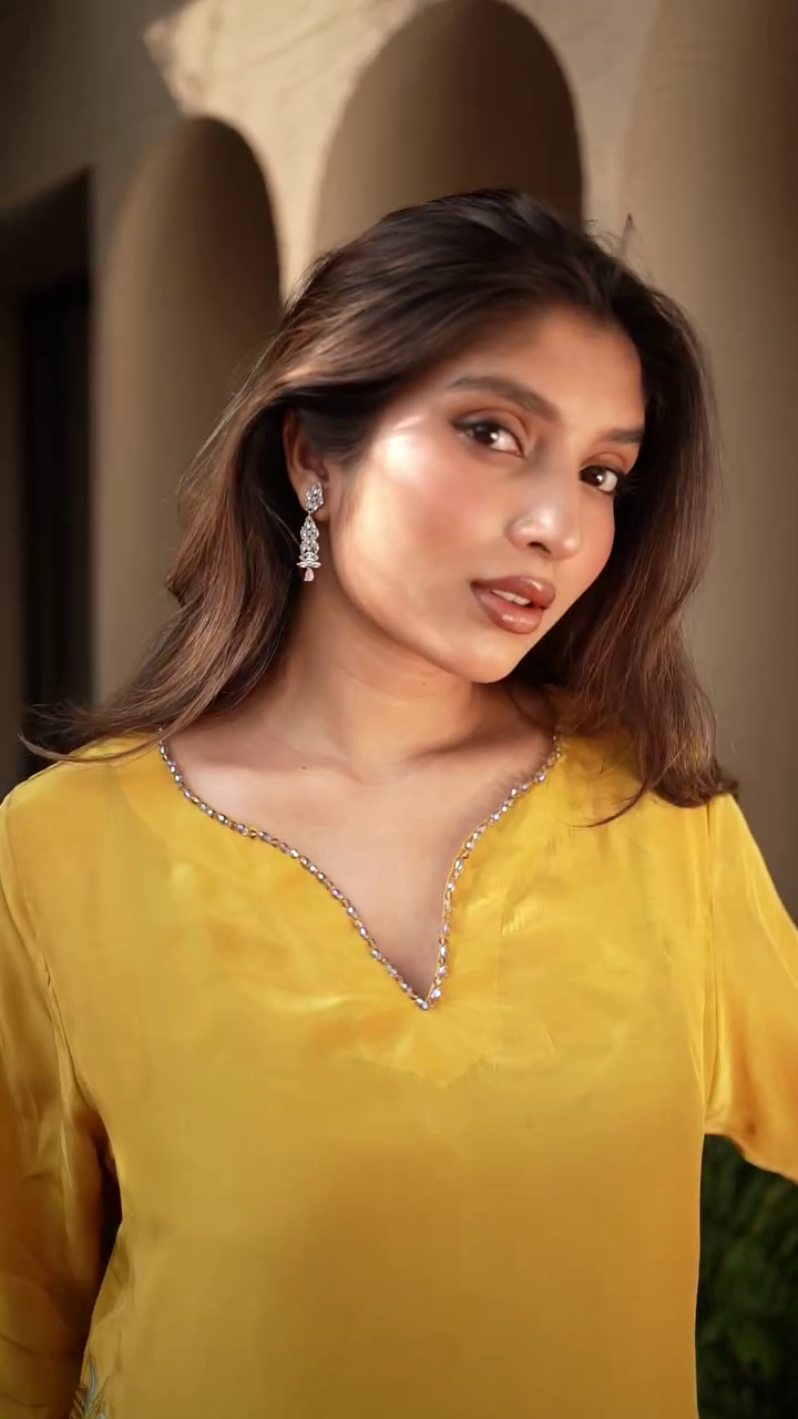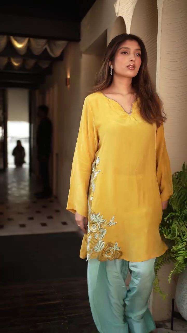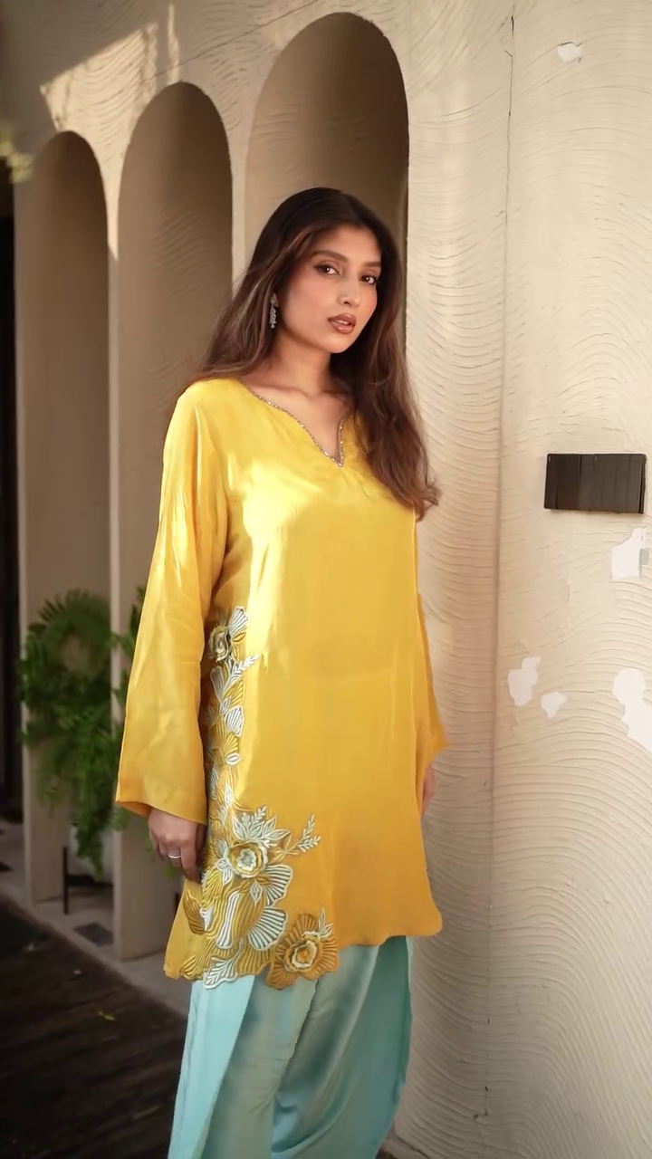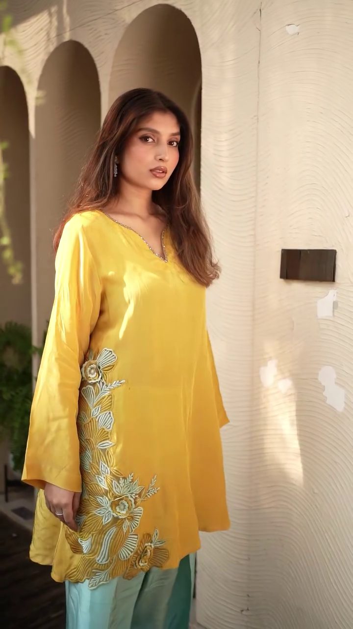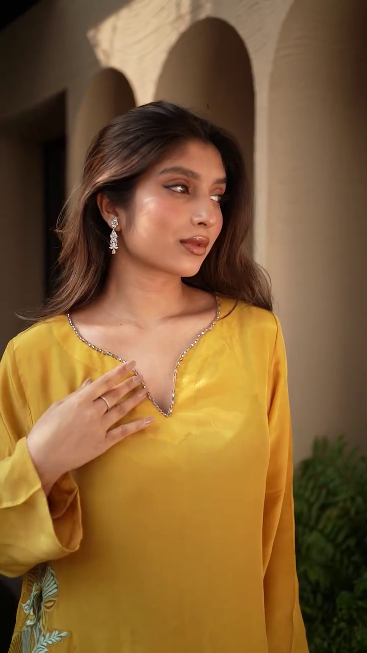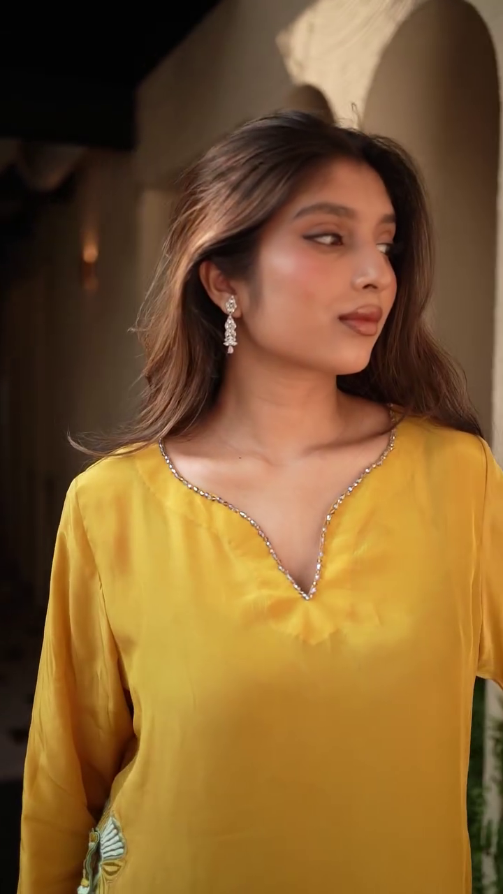 + Free ShippingMustard yellow embroidered Kurta with Trousers